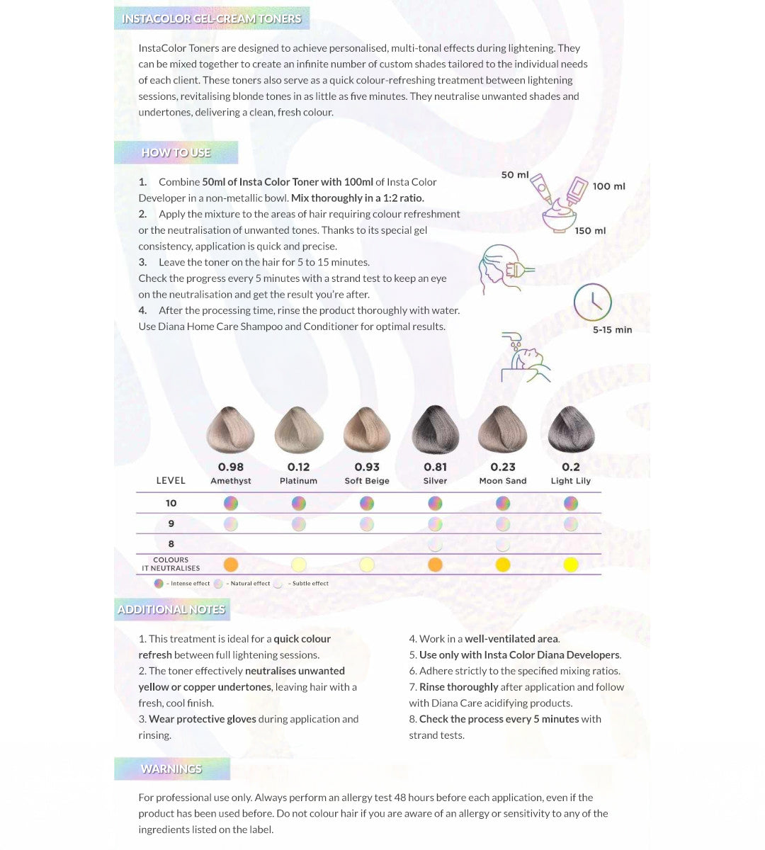 INSTA COLOR Gel-Crème Color Toner is an innovative professional toner with a gel-cream texture , designed to refresh blonde tones, neutralize unwanted undertones and create a perfectly clean, fresh color – in just 5 minutes .