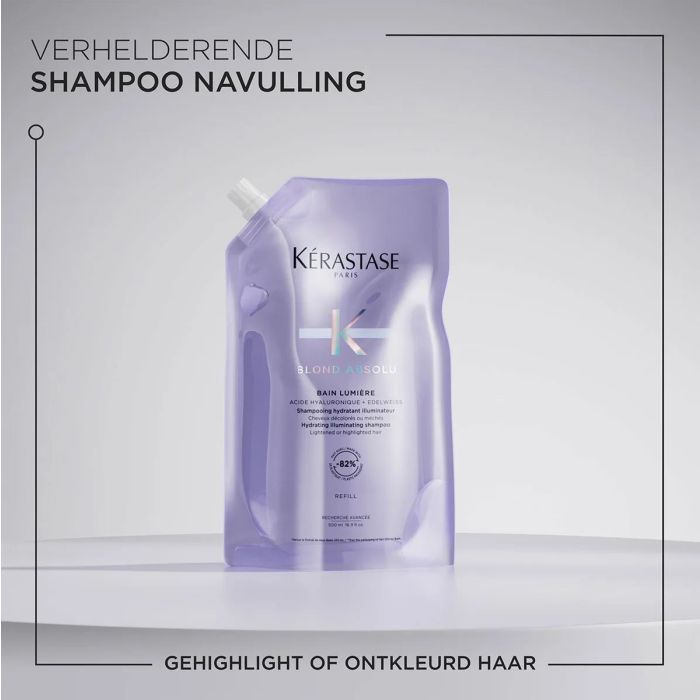 The Kérastase Blond Absolu Bain Lumière 500ml + Refill 500ml is the ultimate shampoo for blonde and light-colored hair. This luxurious formula deeply cleanses, intensely hydrates, and strengthens the hair fiber. Enriched with hyaluronic acid , the shampoo leaves hair feeling silky-soft and with a brilliant shine, up to four times more than normal.
