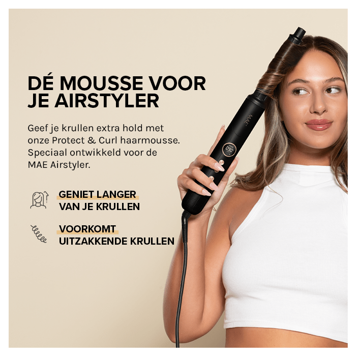 The MAE Protect & Curl Mousse 330ml offers the perfect combination of curl definition, volume, and heat protection . This lightweight mousse is specially formulated for use with the MAE Airstyler but also works perfectly with other styling tools.