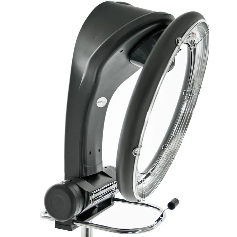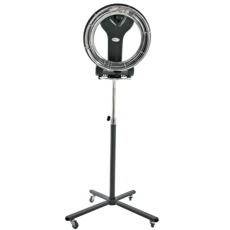 Der Vierarmfuß sorgt für Stabilität während der Anwendung, während die Rollen das Gerät im Salon leicht beweglich machen. Das höhenverstellbare Stativ ermöglicht eine ergonomische Handhabung und eine komfortable Positionierung über dem Kopf des Kunden. Der drehbare Kopf trägt zu einer gleichmäßigen Wärmeverteilung um das Haar bei.