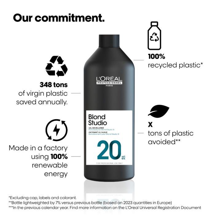 Mix Blond Studio Oil Developer 9T 20 Vol only with Blond Studio Multi-Techniques 9 bleaching powder. Follow the recommended mixing ratio and check the color development regularly. Apply to dry, unwashed hair with a brush for even distribution. Follow the processing time prescribed by L'Oréal Professionnel. Carefully emulsify and rinse thoroughly afterward.