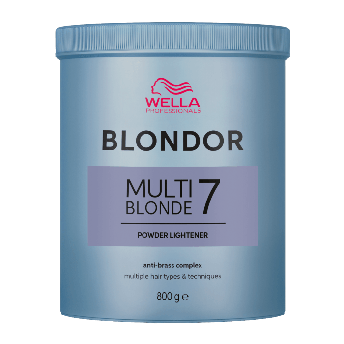 Wella Blondor Powder Multi Blonde has been a favorite among professional hairdressers for years thanks to its powerful, reliable, and controllable lift of up to 7 levels . With its iconic anti-yellow formula , this bleaching powder effectively reduces warm undertones during the bleaching process, for a bright, natural-looking blonde look —even on previously colored hair.