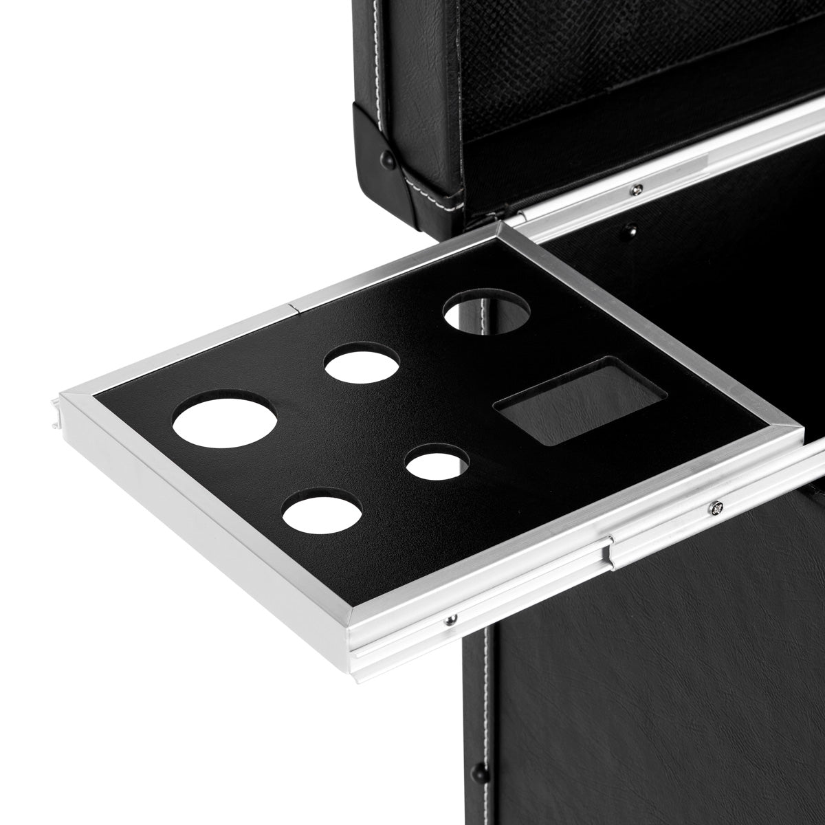 Cet organiseur spacieux est doté de nombreux compartiments , dont des tiroirs coulissants avec poignées, des poches ouvertes, des espaces de rangement dédiés et des poches pratiques pour les outils et produits de coiffure. Son agencement intelligent facilite le rangement et optimise considérablement le flux de travail . Grâce à ses roulettes pivotantes, l'assistant se déplace aisément, tandis que sa poignée extensible à l'arrière assure un transport confortable.