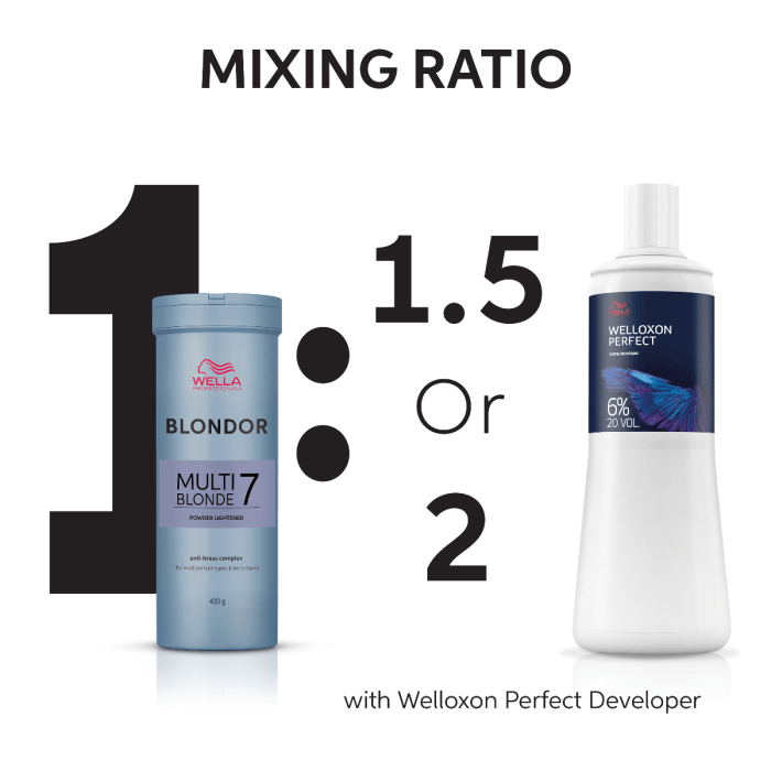 Meng Wella Blondor Lightening Powder met de aanbevolen developer (Welloxon 6%, 9% of 12% of Color Touch Emulsion 1.9% / 4%). Breng gelijkmatig aan op droog haar. Begin bij de lengtes en punten, vervolgens de aanzet. Laat maximaal 50 minuten inwerken. Controleer elke 5–10 minuten. Na het blonderen grondig uitspoelen met warm water en nabehandelen met een kleurstabiliserende shampoo.