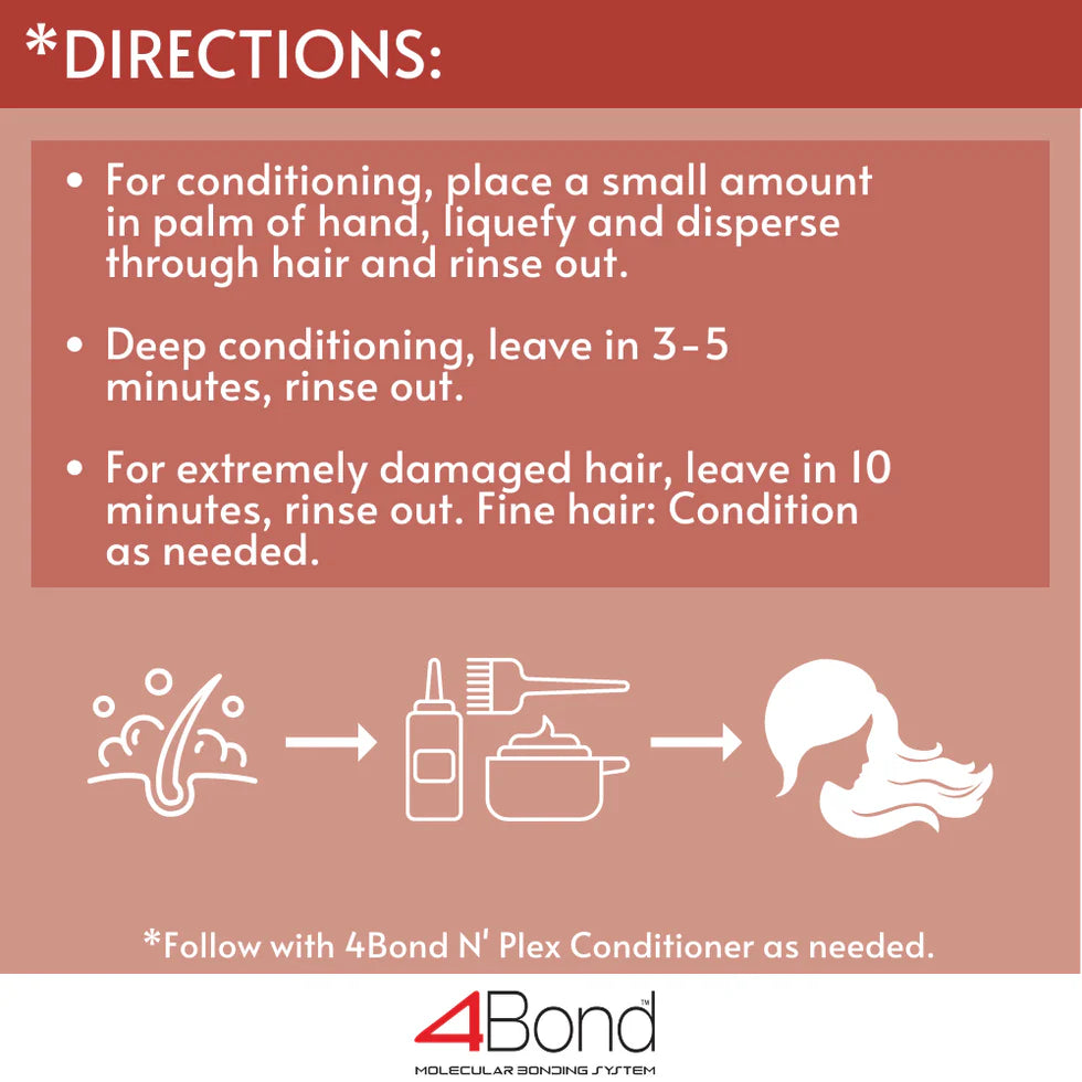 De 4Bond Bond Building Conditioner is een rijke, romige, intens herstellende conditioner die speciaal is ontwikkeld voor gekleurd, chemisch behandeld en beschadigd haar. De formule, met een pH van 4.5, werkt samen met de 4Bond Shampoo om de haarverbindingen (bonds) opnieuw op te bouwen en te versterken na elke kleur- of chemische behandeling. Dankzij de unieke Smart Target Technology richt 4Bond zich specifiek op de beschadigde delen van het haar, waardoor het van binnenuit wordt hersteld, versterkt en beschermd. Het resultaat is luxueus zacht, glanzend en gezond haar – klaar voor de volgende behandeling.