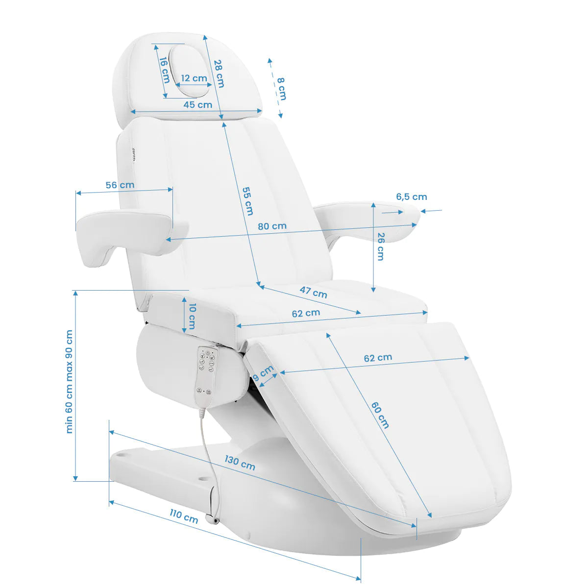 De zithoogte is verstelbaar van 60 cm tot 90 cm, waardoor de stoel eenvoudig kan worden aangepast aan verschillende werkhoogtes. In volledig liggende positie bereikt de stoel een lengte van 200 cm, wat zorgt voor volledige lichaamsondersteuning, zelfs bij behandelingen in ligpositie. Dankzij deze parameters is de stoel geschikt voor een breed scala aan cosmetische en specialistische behandelingen en ondersteunt hij een professionele, ergonomische werkomgeving.