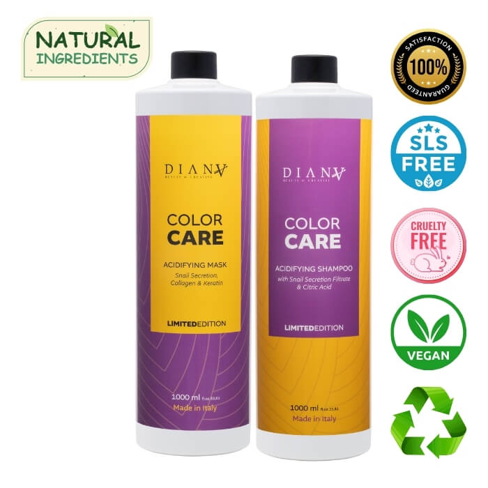 Deze exclusieve combinatie van Color Care Shampoo en Color Care Haarmasker met slakkensecretiefiltraat, gehydrolyseerde keratine, collageen en citroenzuur verzegelt de kleur direct na de kleuring, herstelt de haarstructuur en zorgt voor langdurige hydratatie.