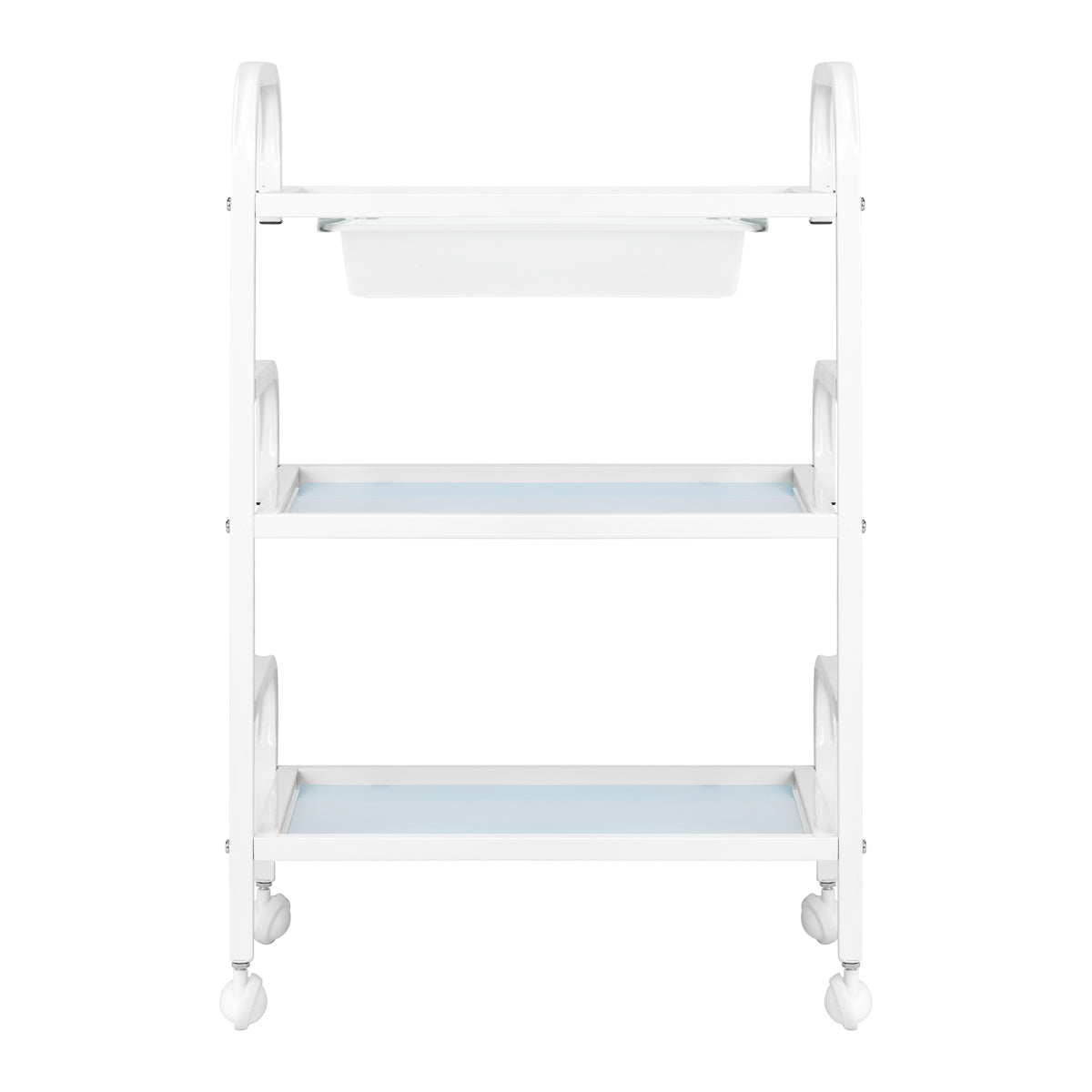 Het frame is vervaardigd uit duurzaam aluminium in witte tinten en gecombineerd met stevige glazen legplanken, wat resulteert in een moderne en esthetische uitstraling. De materialen zijn hygiënisch en eenvoudig schoon te maken, ideaal voor intensief salongebruik. Dankzij vier soepel rollende wielen is de tafel eenvoudig te verplaatsen en flexibel inzetbaar. De solide constructie garandeert stabiliteit, veiligheid en een lange levensduur.