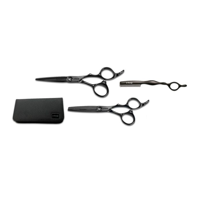 De E-Kwip Kurayami Set 5.5” + 40 is een premium keuze voor kappers die streven naar esthetiek, comfort en functionaliteit in één instrument. De titaniumcoating beschermt tegen oxidatie en verlengt de levensduur van de scharen, terwijl het zwarte design een modern, luxueus accent toevoegt aan je kappersuitrusting.