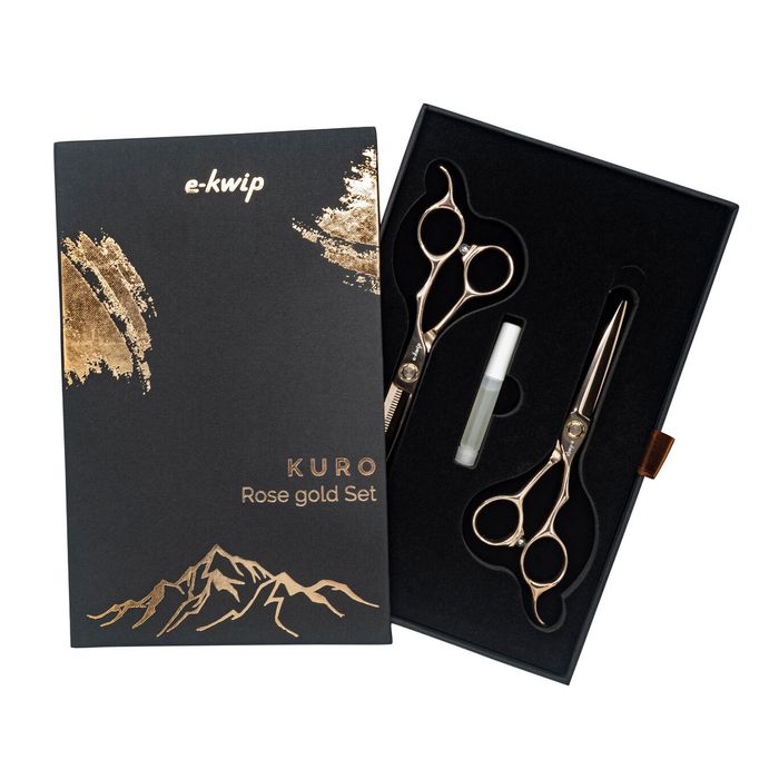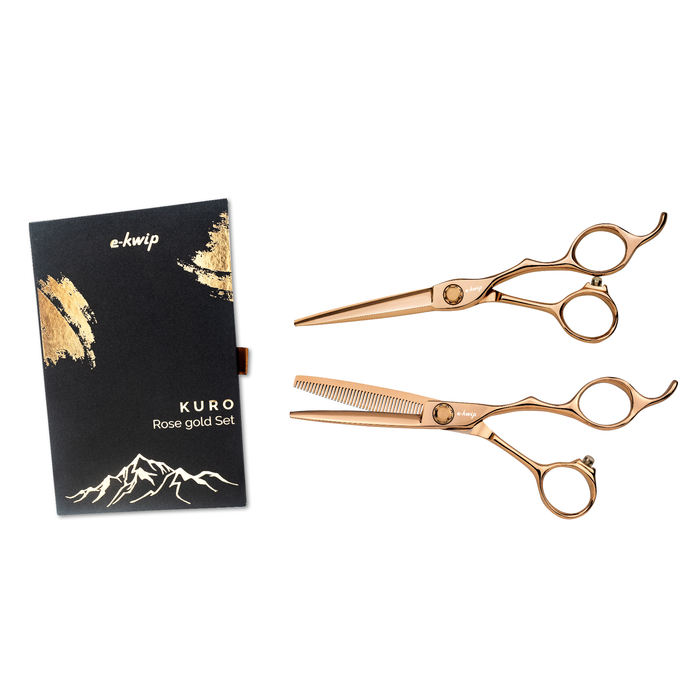 De E-Kwip Kuro Set Rose Gold 5,5 inch is een meesterwerk van Japanse precisie, elegantie en duurzaamheid. Deze exclusieve set – bestaande uit een professionele knipschaar en een modelleerschaar – is ontworpen voor veeleisende kappers die elke knipbeweging willen uitvoeren met uiterste nauwkeurigheid en comfort.