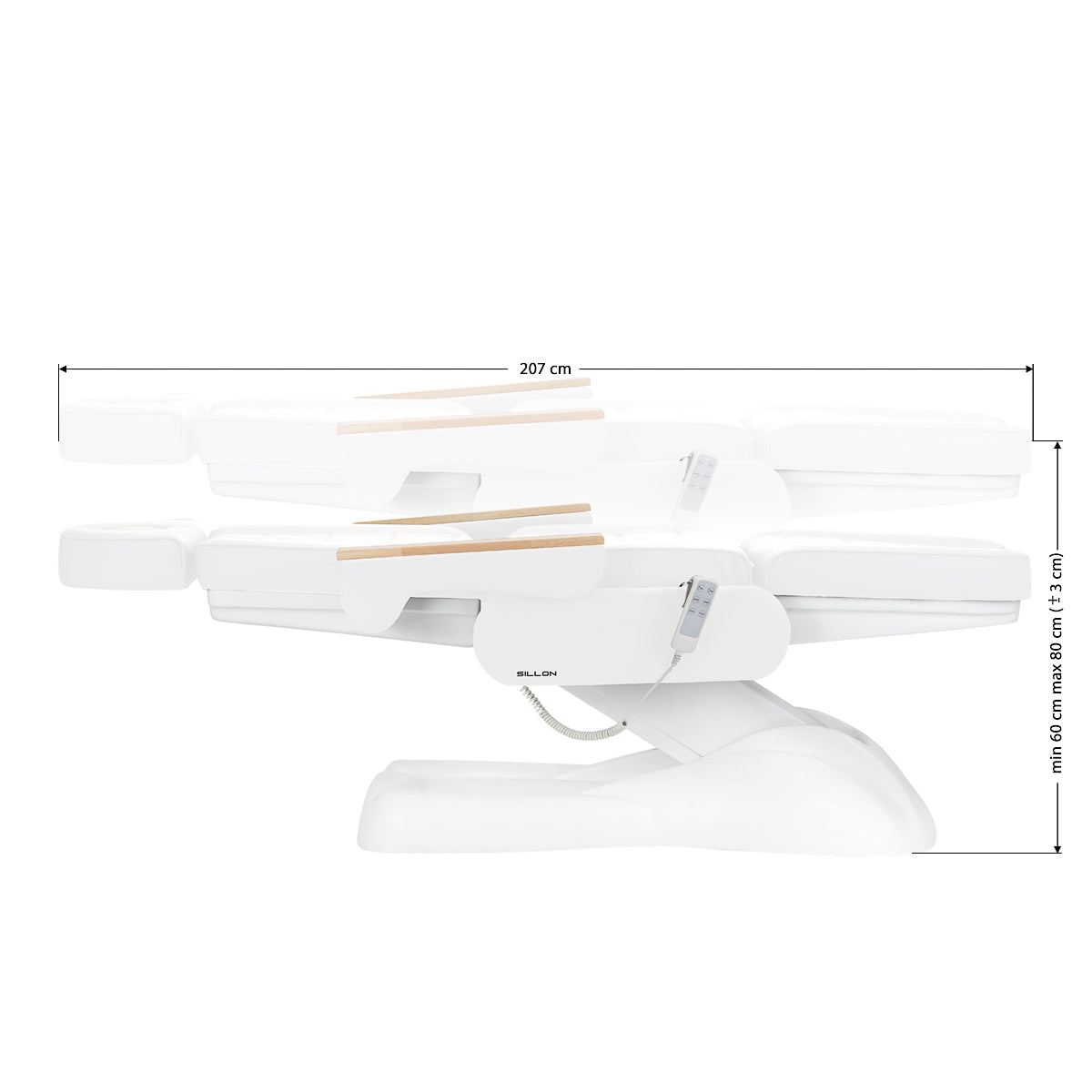 De zithoogte is verstelbaar van 60 cm tot 80 cm (± 3 cm). In volledig uitgeklapte positie bereikt de stoel een lengte van meer dan 2 meter. Deze afmetingen maken de stoel geschikt voor cliënten van verschillende lengtes en ondersteunen een comfortabele werkhouding. Aan de rechterzijde van de zitting bevindt zich een metalen houder voor de afstandsbediening, zodat deze altijd binnen handbereik is en netjes kan worden opgeborgen.