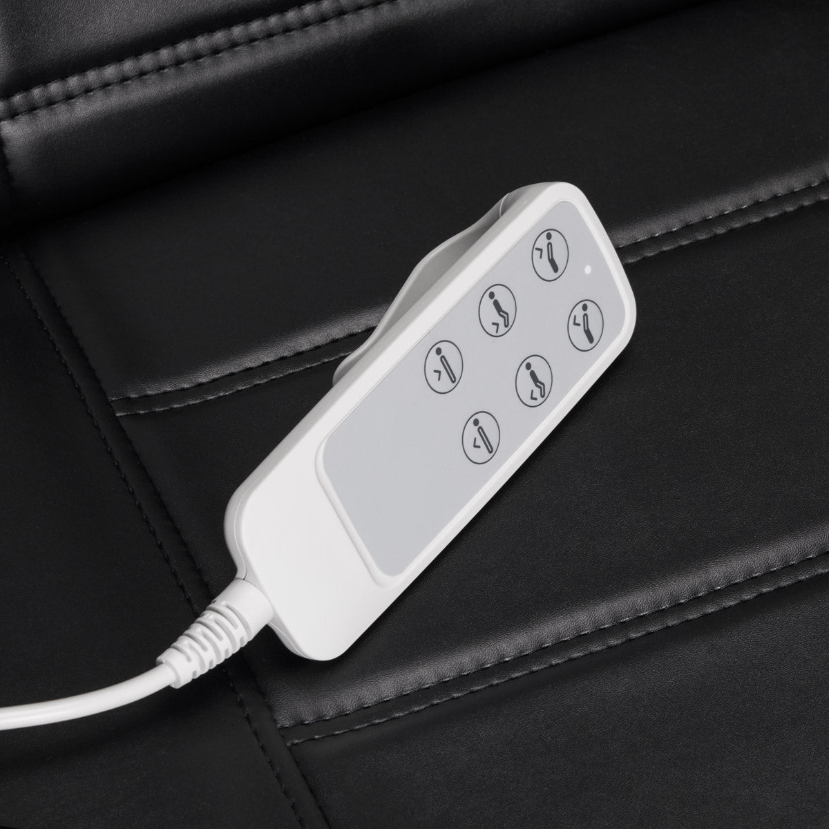 De stoel is ontworpen om jouw workflow te ondersteunen: de verplaatsbare armleuningen maken het instappen makkelijker en geven je extra toegang tijdens de behandeling. De uitschuifbare hoofdsteun helpt de stoel aan te passen aan verschillende lichaamslengtes, terwijl een metalen houder aan de zijkant ervoor zorgt dat de afstandsbediening altijd netjes en binnen handbereik blijft. De vulling van schuim met passende hardheid in combinatie met synthetisch leder in zwart zorgt voor een professionele uitstraling en een prettig zit- en ligcomfort. Het oppervlak is bovendien vochtbestendig en eenvoudig te reinigen, wat essentieel is bij dagelijks gebruik in een salon. Decoratieve houten details op de armleuningen geven de stoel een elegante, premium touch, terwijl de zorgvuldig afgewerkte naden zorgen voor een strakke, stijlvolle look en een ergonomische zitvorm.