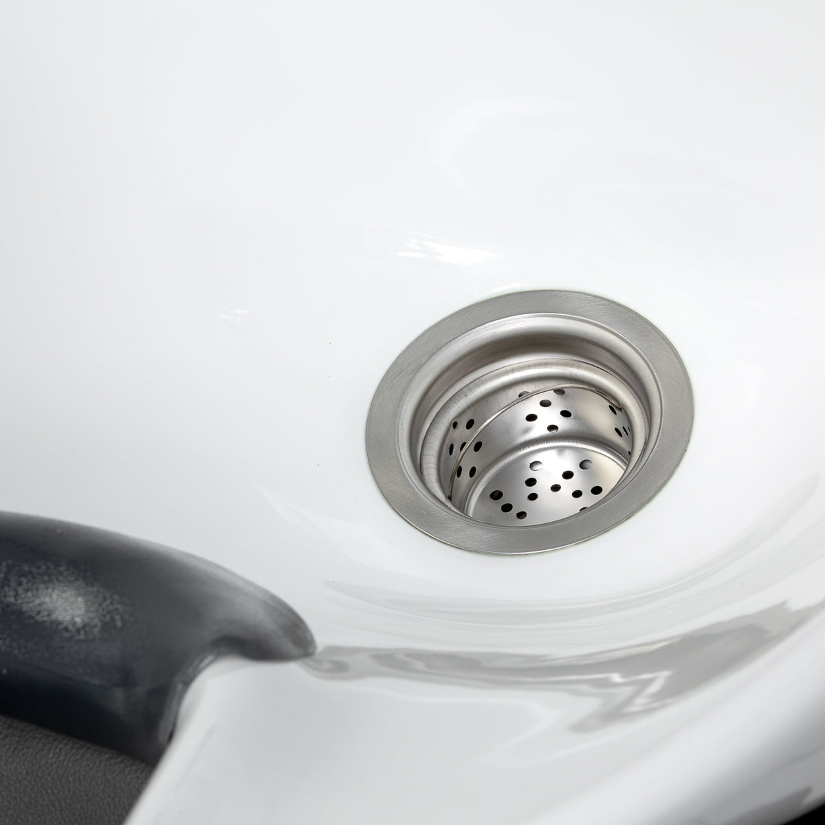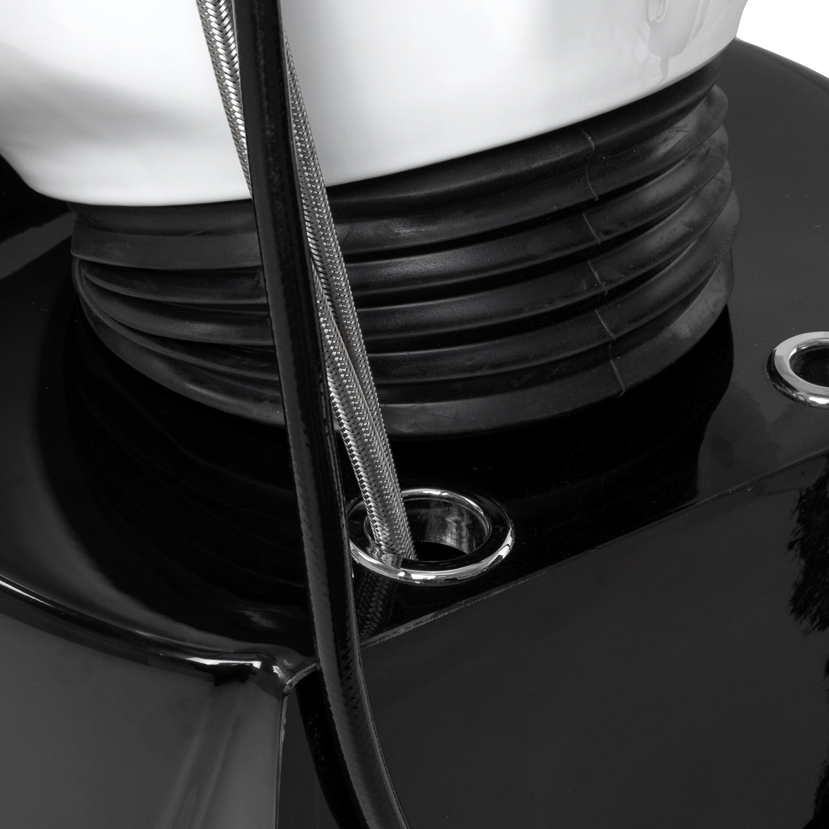 De wasunit is uitgerust met een mengkraan voor eenvoudige regeling van warm en koud water. Een praktische houder voor de handdouche helpt de werkplek overzichtelijk te houden. De afvoerplug met zeef maakt controle van de waterafvoer mogelijk en ondersteunt een hoog hygiëneniveau. De set bevat volledige armaturen – kraan, handdouche en bijpassende slangen – waardoor de wasunit direct gebruiksklaar is. De wateraansluiting is discreet in de basis weggewerkt, zodat leidingen esthetisch verborgen blijven. In de voet van de wasunit bevinden zich bevestigingspunten voor montage aan de vloer, wat de stabiliteit aanzienlijk verhoogt. Deze oplossingen dragen bij aan comfort en efficiëntie in het dagelijks salonwerk.