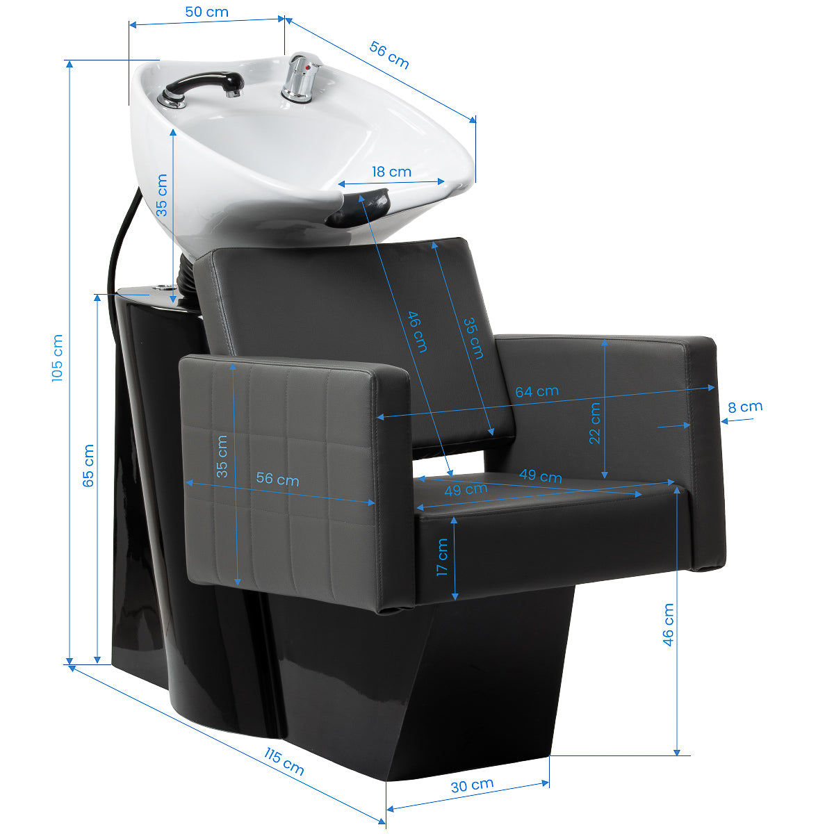 De stijlvolle Gabbiano Ankara kapperswasunit met geometrisch vormgegeven stoel ondersteunt een efficiënte uitvoering van haarverzorgings- en wasbehandelingen. Het meubel is ontworpen met oog voor de dagelijkse praktijk in kapsalons. De geïntegreerde constructie zorgt voor comfort voor zowel de kapper als de klant, terwijl de zorgvuldige afwerking met decoratieve zijstiksels de wasunit tot een esthetisch element van het interieur maakt.