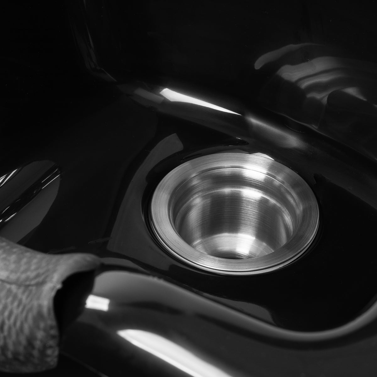 De diepe zwarte wasbak is vervaardigd uit duurzaam kunststof, wat zorgt voor hoge bestendigheid tegen beschadigingen en eenvoudig onderhoud. Het slimme ontwerp beperkt het opspatten van water en producten tijdens het wassen. De ergonomische vorm en de geprofileerde rand met siliconen nekbescherming zorgen voor een comfortabele en stabiele hoofdpositie van de klant. Een praktische houder voor de handdouche verbetert de organisatie van de werkplek, terwijl de afvoerplug met zeef helpt bij het regelen van de waterstroom en het handhaven van optimale hygiëne.