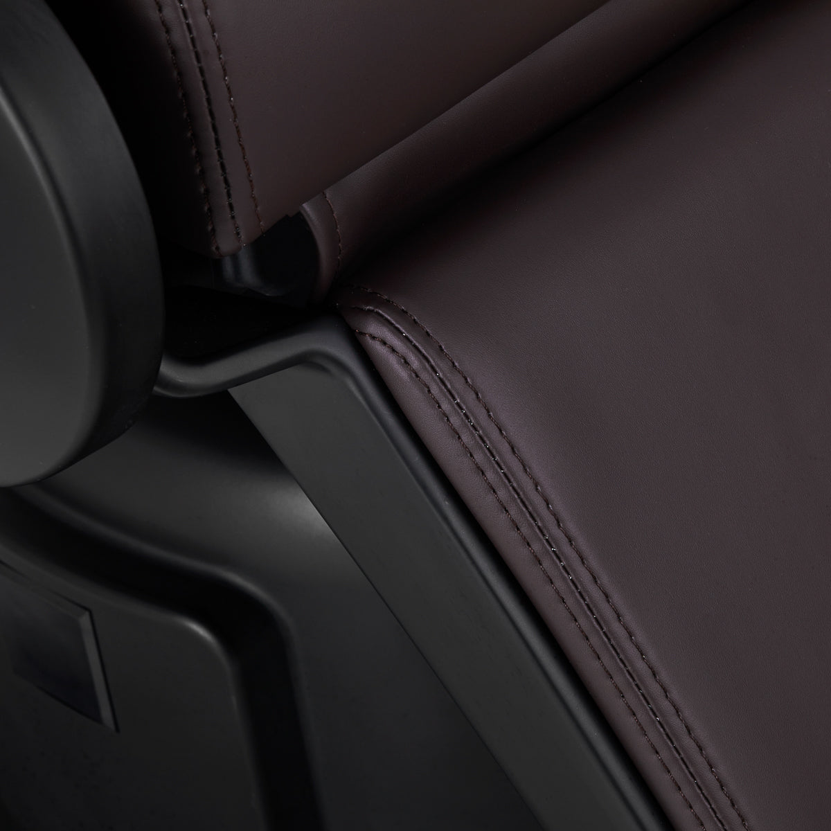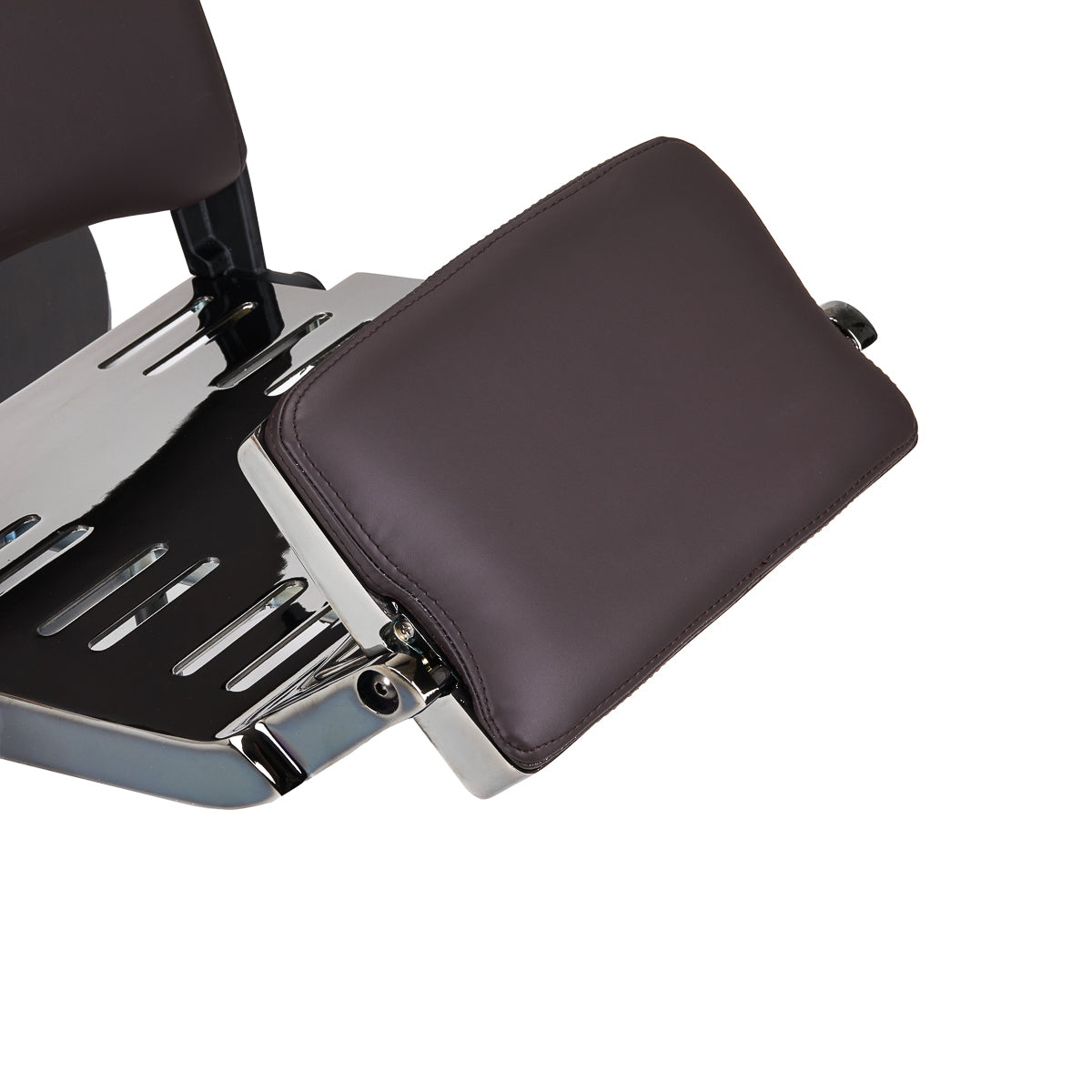 De ergonomisch gevormde rugleuning en de verstelbare hoofdsteun met een verlenging tot 30 cm bieden uitstekende ondersteuning voor rug en hoofd, wat vooral belangrijk is bij langere behandelingen. Het draaimechanisme maakt efficiënt werken mogelijk en vergemakkelijkt de toegang tot de klant vanuit elke hoek. De stoel kan worden versteld tot een half-liggende positie, wat extra comfort en betere toegankelijkheid biedt bij specifieke diensten. De armleuningen zijn op de juiste hoogte geplaatst, zodat de schouders van de klant correct gepositioneerd blijven, wat een ontspannen houding bevordert en het uitvoeren van precisiebehandelingen aanzienlijk vergemakkelijkt.