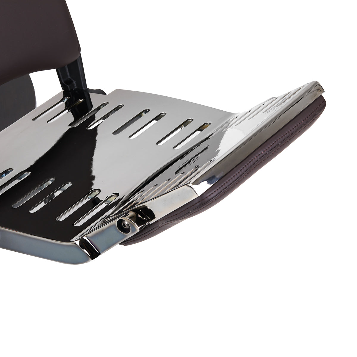 De stevige basisconstructie garandeert uitstekende stabiliteit en langdurige duurzaamheid. De bekleding van synthetisch leer in bruintinten voelt aangenaam aan, is vochtbestendig en eenvoudig te reinigen, wat ideaal is voor dagelijks professioneel gebruik. De combinatie van solide constructie, hoogwaardige materialen en elegant design maakt deze barberstoel niet alleen functioneel, maar ook een stijlvolle en professionele aanvulling op elke salon.