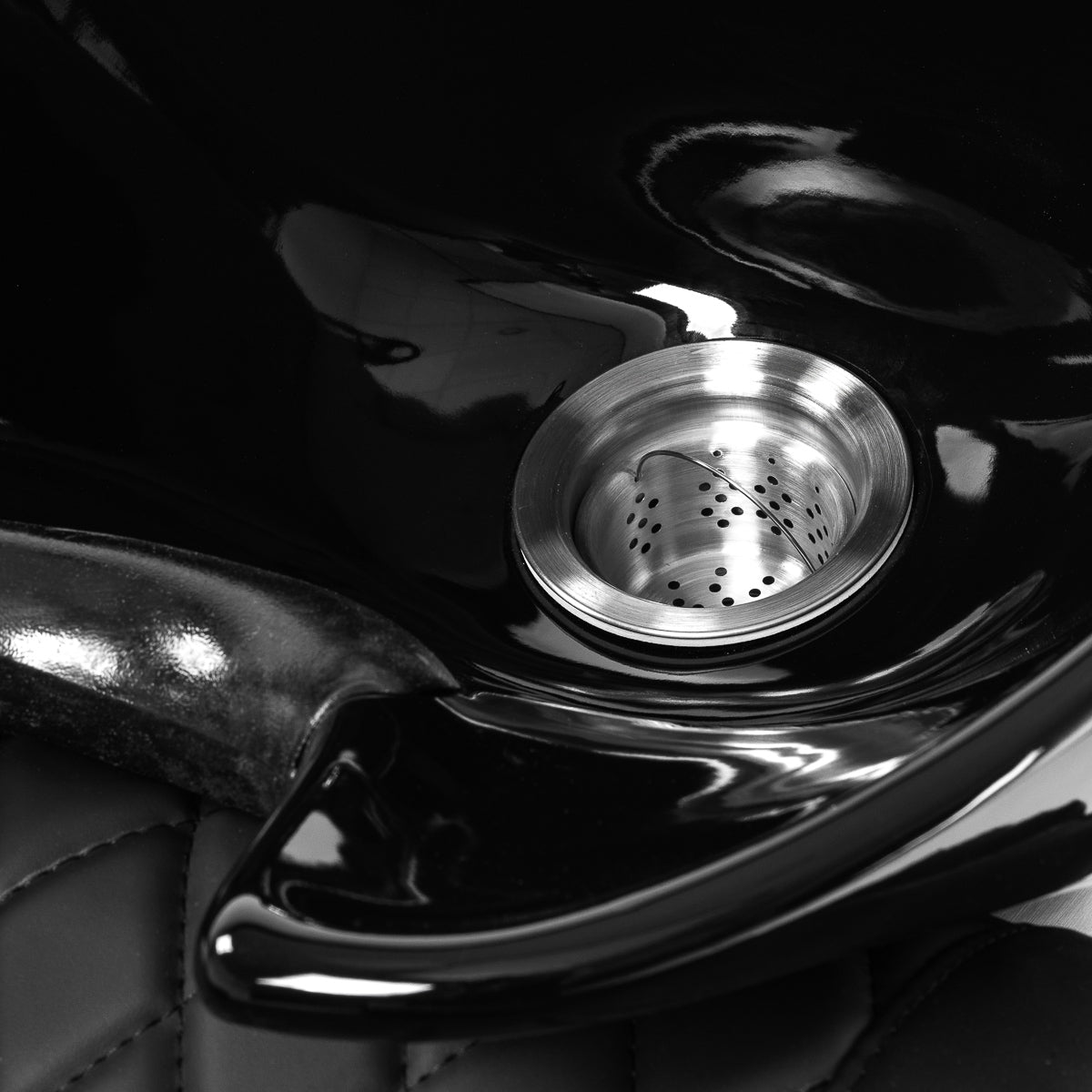 De wasunit is uitgerust met een mengkraan voor eenvoudige temperatuurregeling. Een afvoerplug met speciale zeef helpt de waterstroom te controleren en ondersteunt optimale hygiëne. Een praktische houder voor de handdouche vergemakkelijkt het dagelijkse werk, terwijl de wateraansluiting discreet in de kolom onder de wasbak is weggewerkt voor een nette uitstraling. De set wordt geleverd met complete armaturen in zwart en chroom – kraan, handdouche en bijpassende slangen – klaar voor directe installatie. De ergonomische stoelvorm en voetensteun zorgen voor comfort en ondersteuning bij diverse behandelingen.
