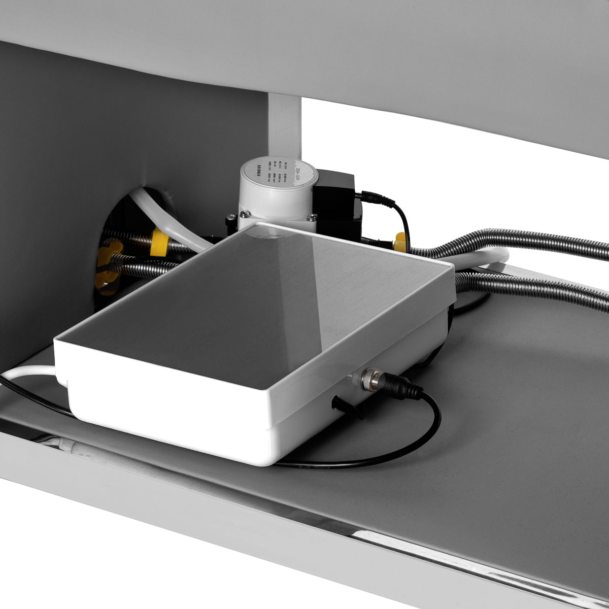 De wasunit is voorzien van een mengkraan waarmee de watertemperatuur eenvoudig kan worden aangepast aan de wensen van de klant. Een speciale houder voor de douchekop en een chromen afvoerplug met filter zorgen voor optimale hygiëne en watercontrole. Alle aansluitingen zijn netjes weggewerkt in de basis, wat bijdraagt aan een strakke en professionele uitstraling. De set wordt aangevuld met een comfortabele poef voor het personeel, wat het systeem tot een complete SPA-oplossing maakt.