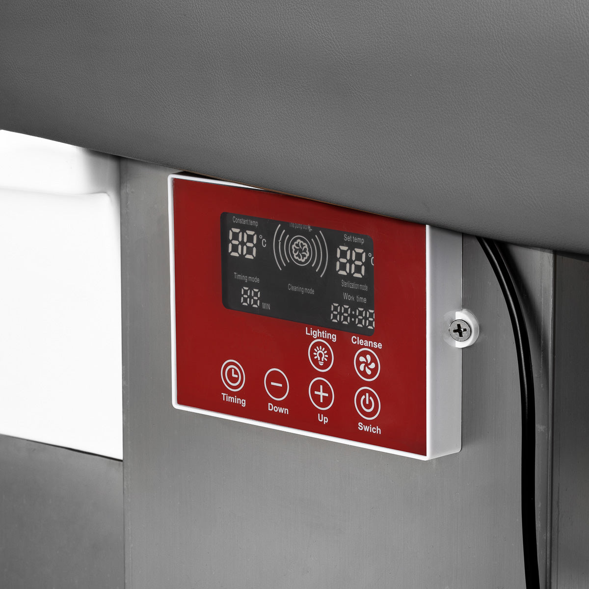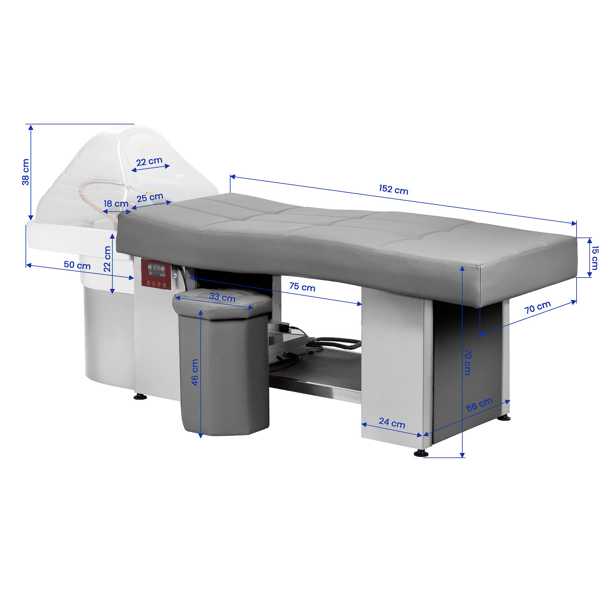 Het intuïtieve touchbedieningspaneel biedt volledige controle over alle functies van de wasunit. Het maakt het mogelijk om watertemperatuur en behandeltijd nauwkeurig in te stellen en continu te monitoren via het ingebouwde display. Daarnaast kan via het paneel de lichttherapie worden geactiveerd, waarbij de waskom wordt verlicht voor een extra luxueuze en ontspannende sfeer. Het stoomapparaat wordt bovendien geleverd met een afstandsbediening voor extra gebruiksgemak.