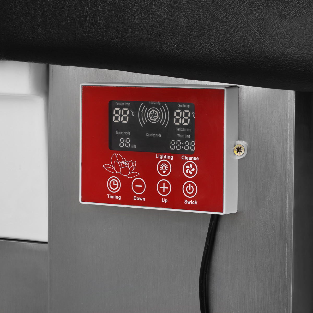 Het gebruiksvriendelijke touchpanel biedt volledige controle over de functies van de wasunit. U kunt werktijd en watertemperatuur instellen en realtime volgen via het ingebouwde display. Daarnaast maakt het paneel lichttherapie mogelijk door de kom te verlichten, wat een luxueuze en ontspannen sfeer creëert. De stoomunit is bovendien uitgerust met een afstandsbediening voor extra gebruiksgemak.