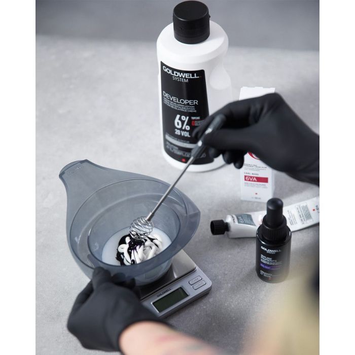 Meng de Goldwell System Developer 6% met de Goldwell Topchic Permanent Hair Color volgens de aanbevolen verhouding. Roer tot een gladde, homogene massa ontstaat. Aanbrengen op droog haar met een kwast, laten inwerken volgens de Topchic-richtlijnen en zorgvuldig uitspoelen. Vermijd contact met de ogen en gebruik altijd geschikte handschoenen.