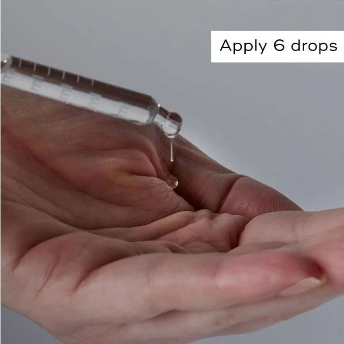 Reinig de huid grondig. Breng in de ochtend 4–6 druppels van het serum aan op het gezicht, de hals en het decolleté. Laat volledig intrekken voordat je een moisturizer aanbrengt.