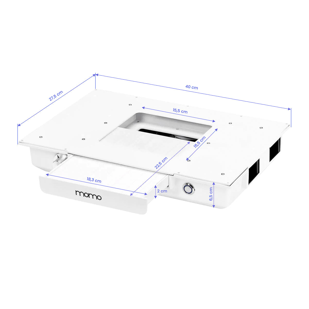 De in het werkblad geïntegreerde Momo J-02 cassette stofafzuiger verhoogt het comfort en de hygiëne aanzienlijk door stof en fijn vuil effectief te verwijderen dat ontstaat tijdens cosmetische behandelingen zoals manicures. Hierdoor blijft de lucht in de salon schoon en de werkplek vrij van vervuiling, wat de veiligheid van zowel de stylist als de klant vergroot. De stofafzuiger is eenvoudig in gebruik en onderhoud. Regelmatige reiniging en tijdige vervanging van het filter garanderen een constante en hoge zuigkracht. Extra vervangfilters zijn afzonderlijk verkrijgbaar (SKU 123581).