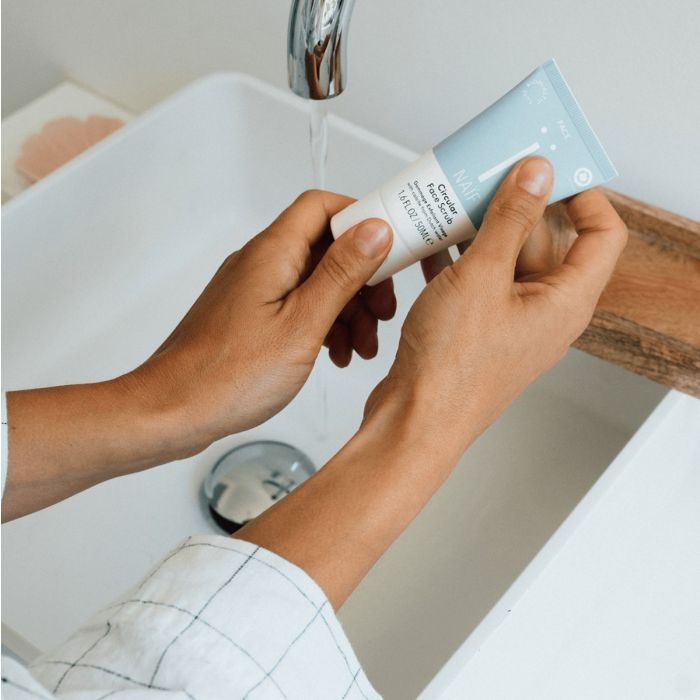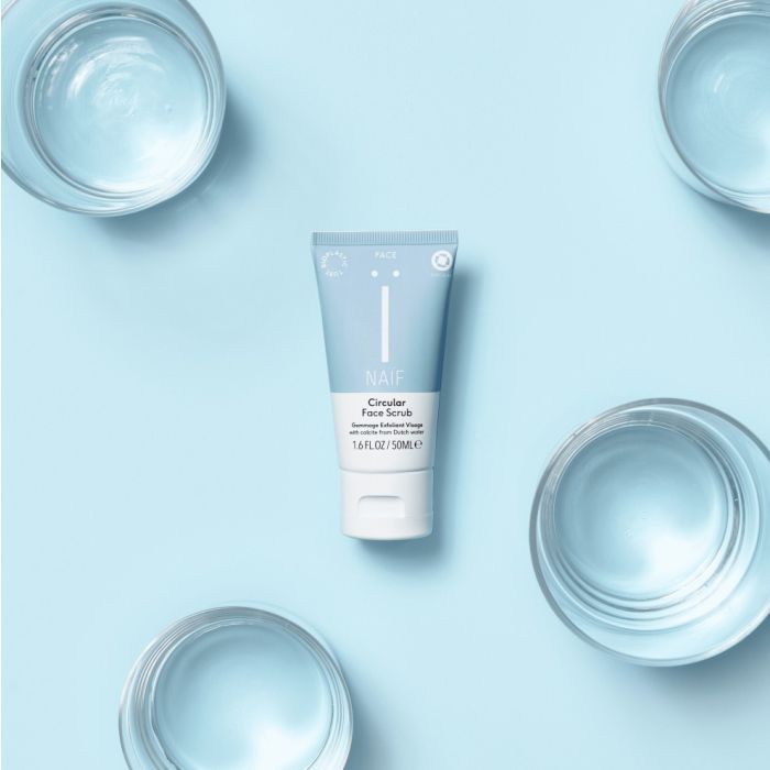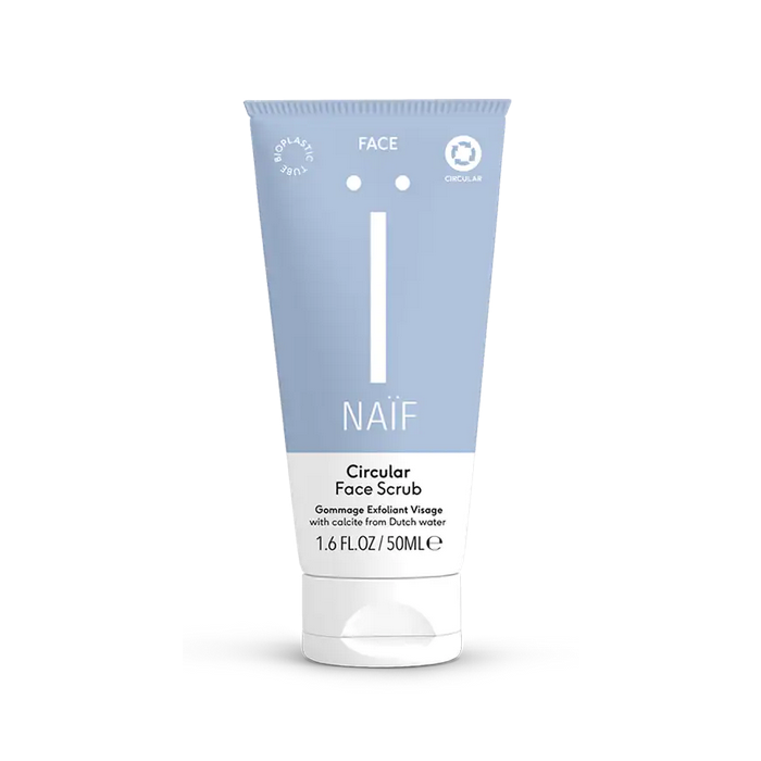 De Naïf Grown Ups Circular Face Scrub 50ml is een natuurlijke, zuiverende gezichtsscrub die de huid intensief reinigt en dode huidcellen zacht verwijdert. Dankzij de innovatieve formule met circulaire scrubdeeltjes – fijne korrels die onttrokken zijn uit Nederlands drinkwater – is dit product 100% circulair en volledig duurzaam.