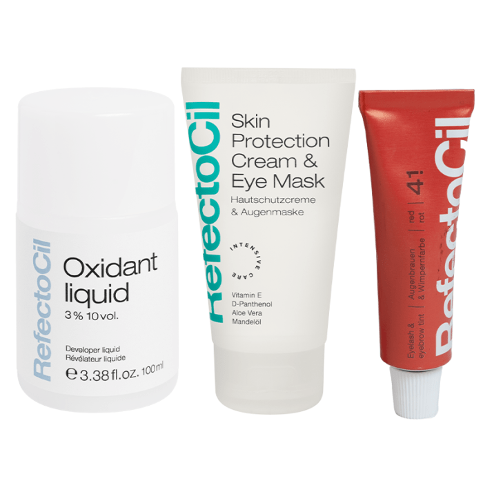 De complete set bevat de RefectoCil Wenkbrauwverf 4.1 Rood, een milde Liquid Ontwikkelaar 3% en een beschermende Afdekcrème met vitamine E en D-panthenol voor extra comfort tijdens de behandeling.