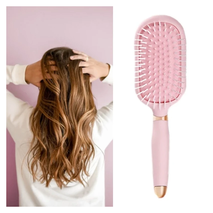 Ontdek de perfecte combinatie van comfort, flexibiliteit en haarverzorging met deze roze luchtkussen haarborstel.