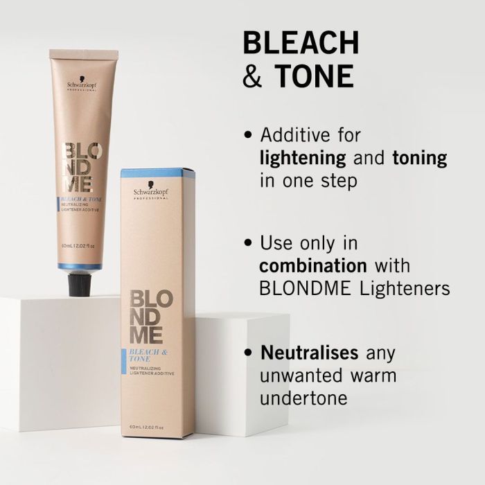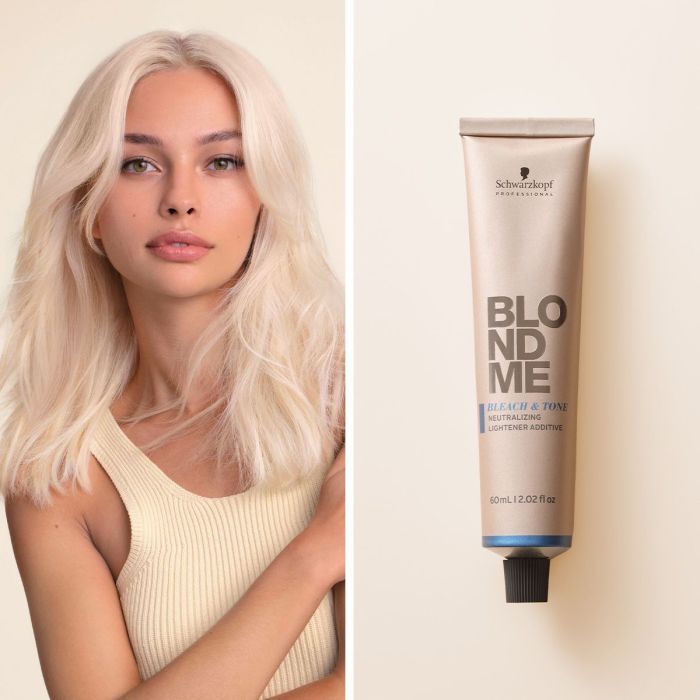 De Schwarzkopf BlondMe Bleach & Tone 60ml is een professionele toner en lifter in één, ontworpen om in één stap zowel ongewenste warme ondertonen te neutraliseren als het haar tot 8 tinten op te lichten. Ideaal voor wie een koele, egale en stralende blonde basis wil creëren, zelfs op donkerder haar. De kleuren zijn onderling perfect mengbaar, waardoor gepersonaliseerde, moderne blondresultaten eenvoudig bereikt worden — van ijzig koel tot zacht pastelmatterend.