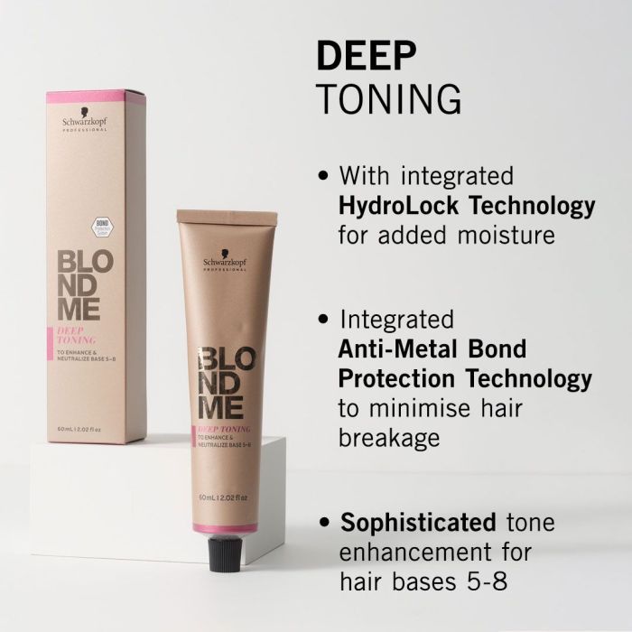 De BlondMe Deep Toners zijn ideaal voor het corrigeren van warme blondtinten, het creëren van natuurlijke of koele diepte en het harmoniseren van highlights op donkerblond haar. Geschikt voor zowel volledige behandelingen als nabehandelingen na het blonderen.