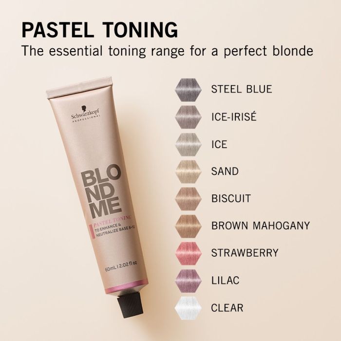 De Schwarzkopf BlondMe Pastel Toning 60ml is een professionele, ammoniakvrije toner die speciaal ontwikkeld is voor geblondeerd haar, highlights en natuurlijk lichtere ondertonen (basissen 8–10). Deze hoogwaardige toner biedt een subtiele, matte pastelafwerking, waarmee je blond haar verfijnt, egaliseert en neutraliseert voor een ultramoderne, frisse blondlook.