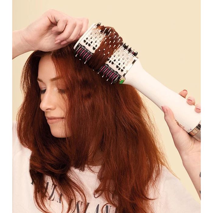 Dankzij de slimme Nat Haarmodus droogt deze föhnborstel pas gewassen haar zacht en voegt het direct volume toe, met een gelijkmatige warmteverdeling en drie luchttemperatuuropties. Daarna schakel je eenvoudig over naar de Droog Haarmodus, waarin de geïntegreerde verwarmde gladmakende kam met keramische coating pluizig haar temt en een gladde, strakke finish creëert – allemaal bij lagere temperaturen voor gezond en glanzend haar.