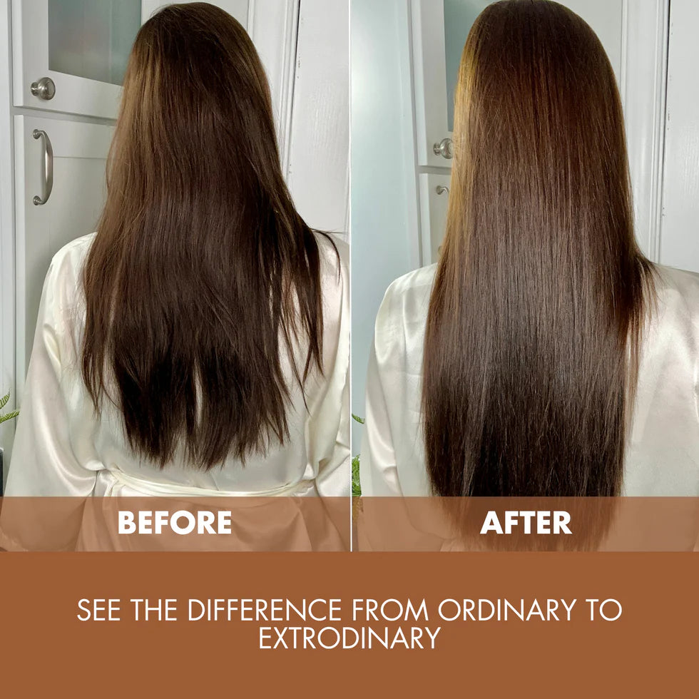 De combinatie van keratine, panthenol en botanische extracten zorgt voor diep herstel, vochtverzegeling en langdurige glans.